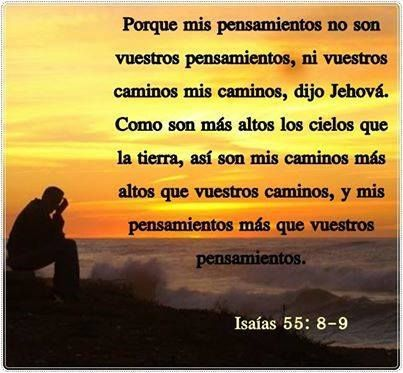 8 “Porque mis pensamientos no son vuestros pensamientos, ni vuestros caminos mis caminos”, declara Yahweh. 9 “Porque como los cielos son más altos que la tierra, así mis caminos son más altos que los vuestros, y mis pensamientos más que vuestros pensamientos”.
